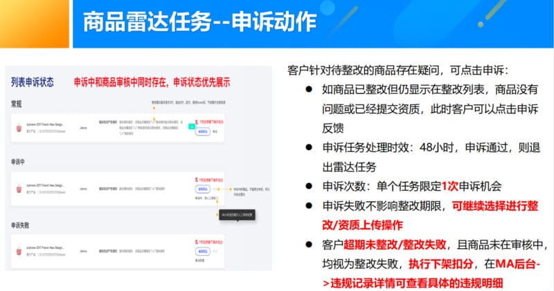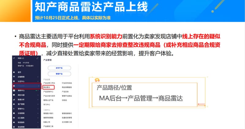 商品雷达主要适用于平台利用系统识别能力前置化为卖家发现店铺中线上存在的疑似不合规商品,同时提供一定期限给商家去排查整改违规商品(或补充相应商品合规资质证明),减少直接处置给卖家带来的经营影响,提升客户体验。
