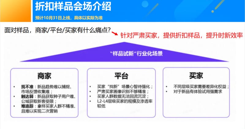 针对严肃买家,提供折扣样品,提升时新效率。每个商家最多可以报名200个商品参与,所有可以参与的商品尽量一次性提报完成。